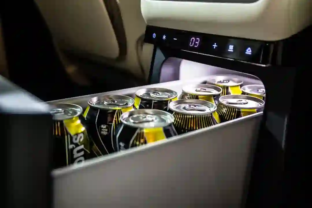 这个冷暖箱还得多说两句,它的容量可以装进 12 个 330mL 的易拉罐,制冷功能由空调压缩机而非冷却半导体实现,因此冷冻效果更好。另外,它还能加热到 35-50℃,因此可以兼做温奶器。展车上特地放了两个奶瓶,向我们强调 L9 仍是一辆家用 SUV。