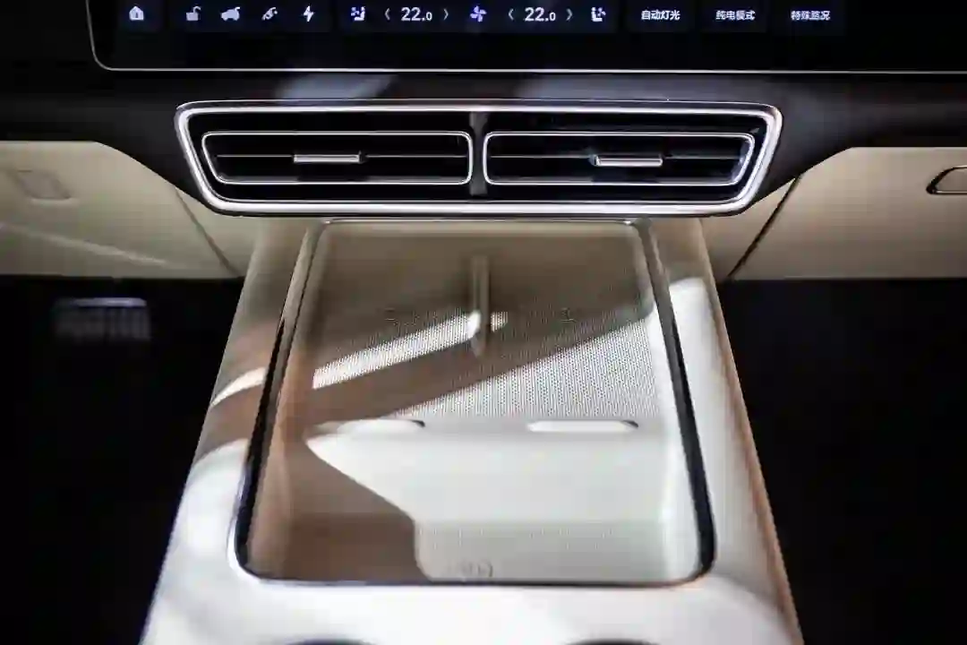 由于使用了怀档式换档机构,L9 的中央通道空间有了更大空间,放得下两个手机无线充电口,下方也留出了足够放下手提包的空间。在储物和随身电子产品的存放空间上,理想还是很家用的。