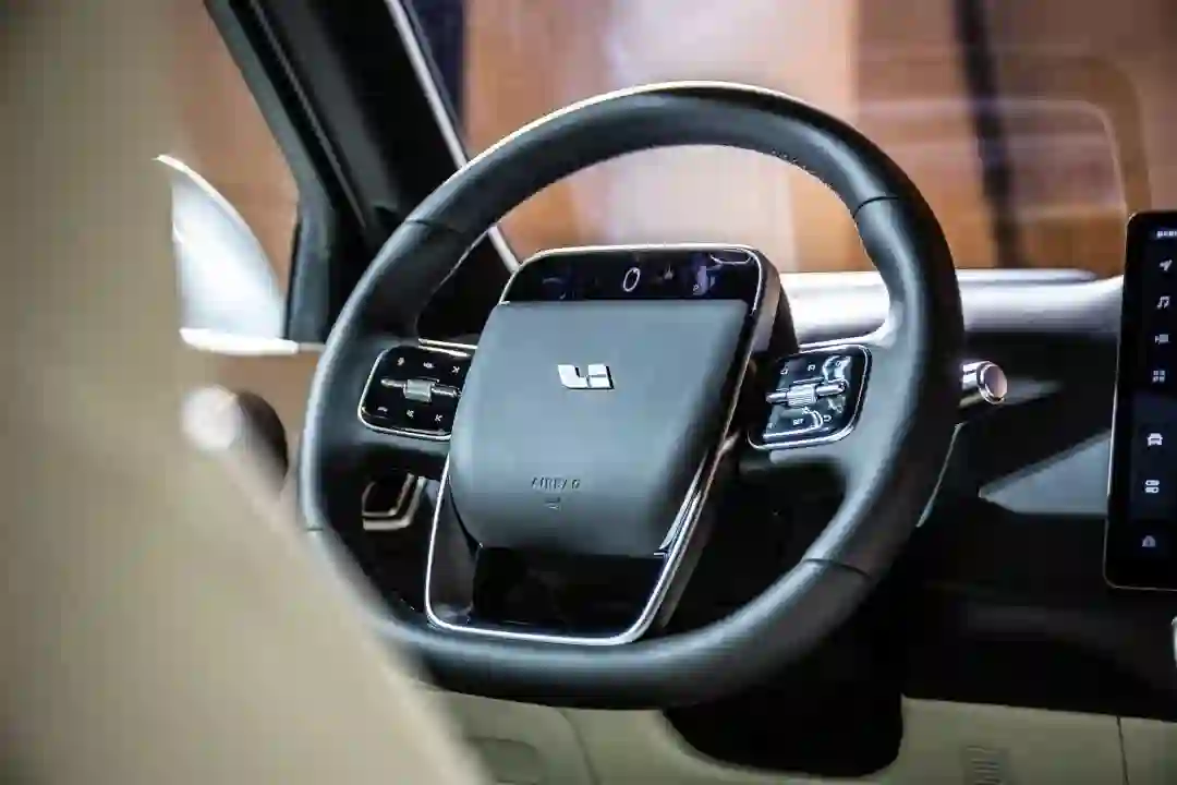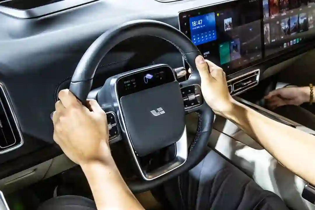 好用,意味着要适当做一点减法,比如取消“仪表盘”。L9 的仪表盘取消了,但不是完全取消,关于驾驶的信息被放在方向盘上的驾驶安全交互屏中显示,显示内容也很简单,左边是续航里程,右边可切换油耗、电耗显示,外加档位和车速信息。