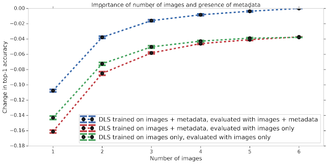 当输入更多图像(蓝线)或元数据(对比蓝线与红线)时,DLS 的准确率会上升。当输入中缺少元数据时,如果单独使用图像训练 DLS,则当前 DLS(绿线)的准确率只会出现小幅提升