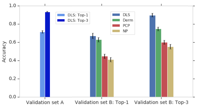 如“ 用于皮肤病鉴别诊断的深度学习系统 (A Deep Learning System for Differential Diagnosis of Skin Diseases)”中所述,我们开发出一种 深度学习系统 (deep learning system, DLS),用于处理基本护理中最常见的皮肤病。我们的结果表明,基于相同的患者病例信息(图像和元数据),DLS 可准确诊断出 26 种皮肤病,堪比美国职业认定的皮肤科医生。显然,此研究展现出了 DLS 帮助未经额外专业培训的全科医生提高准确诊断皮肤病能力的潜力。