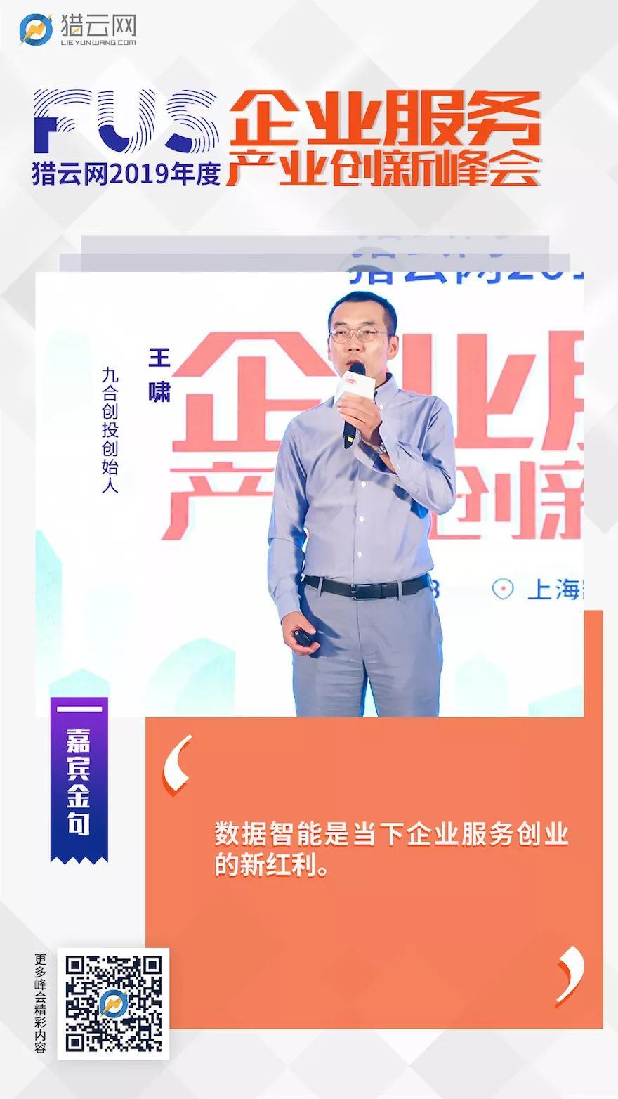 峰会现场,九合创投创始合伙人王啸就《数据智能视角下的企业服务新机会》发表了主题演讲。
