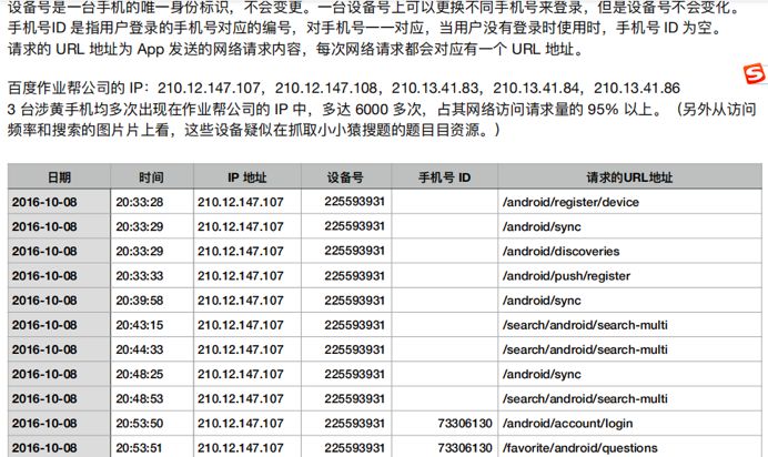 小猿搜题调查发现,这5个IP地址均为作业帮办公所在地使用的IP地址。“商业人物”从小猿搜题获取了这三台涉黄手机的所有网络请求的PDF版本资料,共146页。资料显示,这三台手机借助这5个IP地址访问小猿搜题达6000多次,占网络请求总量的95%以上。