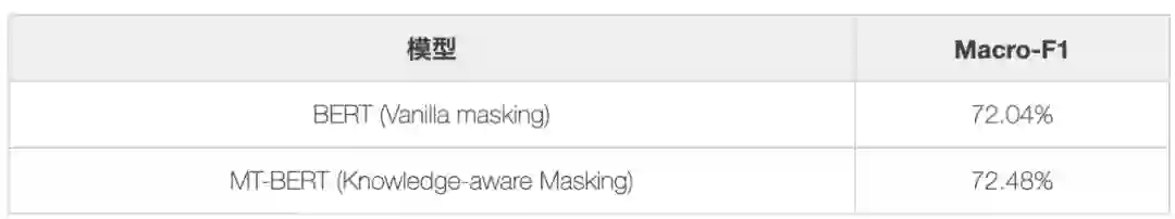BERT模型通过字的搭配(比如“全X德”),很容易推测出被“掩盖”字信息(“德”),但这种做法只学习到了实体内单字之间共现关系,并没有学习到实体的整体语义表示。因此,我们使用Knowledge-aware Masking的方法来预训练MT-BERT。具体的做法是,输入仍然是字,但在随机"遮蔽"时,不再选择遮蔽单字,而是选择“遮蔽”实体对应的词。这需要我们在预训练之前,对语料做分词,并将分词结果和图谱实体对齐。图6右侧展示了Knowledge-aware Masking策略,“全聚德”被随机“遮蔽”。MT-BERT需要根据“烤鸭”,“久负盛名”等信息,准确的预测出“全聚德”。通过这种方式,MT-BERT可以学到“全聚德”这个实体的语义表示,以及它跟上下文其他实体之间的关联,增强了模型语义表征能力。基于美团大脑中已有实体信息,我们在MT-BERT训练中使用了Knowledge-aware Masking策略,实验证明在细粒度情感分析任务上取得了显著提升。