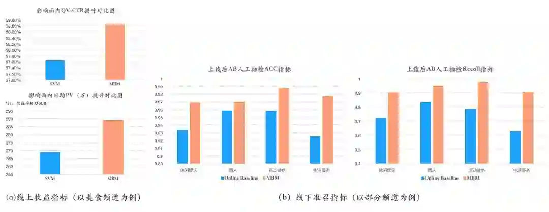 同时对于搜索日志中的高频Query,我们将预测结果以词典方式上传到缓存,进一步减少模型在线预测的QPS压力。MBM累计支持了美团点评搜索17个业务频道的Query意图识别模型,相比原有模型,均有显著的提升,每个频道的识别精确度都达到95%以上。MBM模型上线后,提升了搜索针对Query文本的意图识别能力,为下游的搜索的召回、排序及展示、频道流量报表、用户认知报表、Bad Case归因等系统提供了更好的支持。