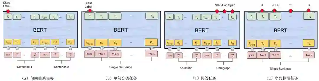图8展示了基于BERT模型微调可以支持的任务类型,包括句对分类、单句分类、问答(机器阅读理解)和序列标注任务。