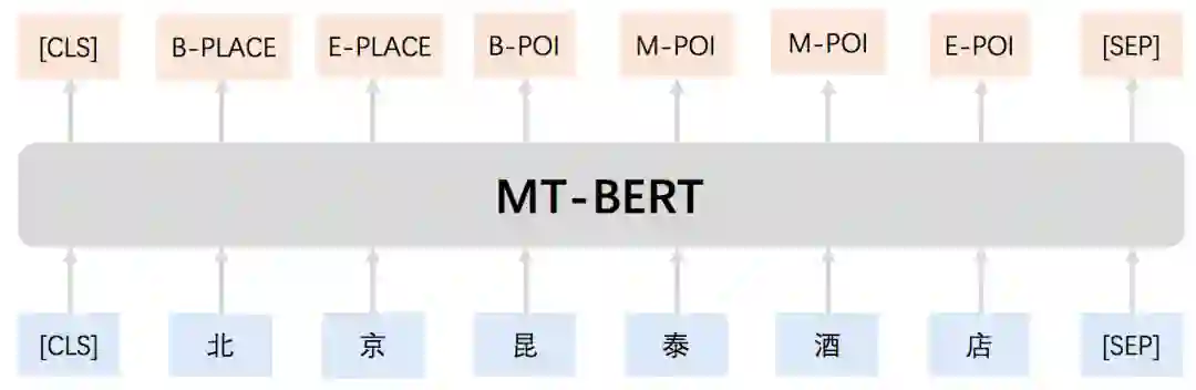 在酒店搜索Query成分分析中,我们对标签采用“BME”编码格式,即对一个实体,第一个字需要预测成实体的开始B,最后一个字需要预测成实体的结束E,中间部分则为M。以图13中酒店搜索Query成分分析为例,对于Query “北京昆泰酒店”,成分分析模型需要将“北京”识别成地点,而“昆泰酒店”识别成POI。MT-BERT预测高频酒店Query成分后通过缓存提供线上服务,结合后续召回策略,显著提升了酒店搜索的订单转化率。