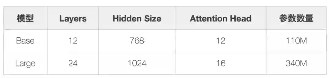 如表1所示,根据参数设置的不同,Google 论文中提出了Base和Large两种BERT模型。