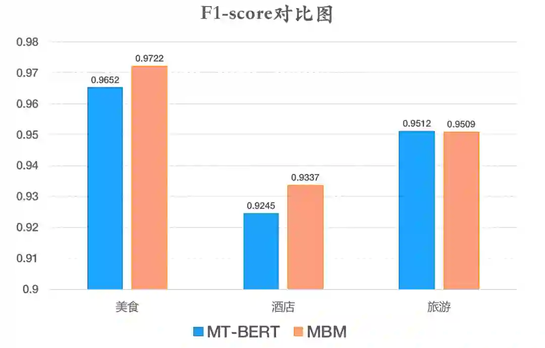 在美团点评搜索Query意图分类任务中,我们优先尝试了模型裁剪的方案。由于搜索Query长度较短(通常不超过16个汉字),整个Sequence包含的语义信息有限,裁剪掉几层Transformer结构对模型的语义表征能力不会有太大影响,同时又能大幅减少模型参数量和推理时间。经过实验验证,在微调过程中,我们将MT-BERT模型裁剪为4层Transfomer结构(MT-BERT-MINI,MBM),实验效果如图7所示。可以发现,Query分类场景下,裁剪后的MBM没有产生较大影响。由于减少了一些不必要的参数运算,在美食和酒店两个场景下,效果还有小幅的提升。