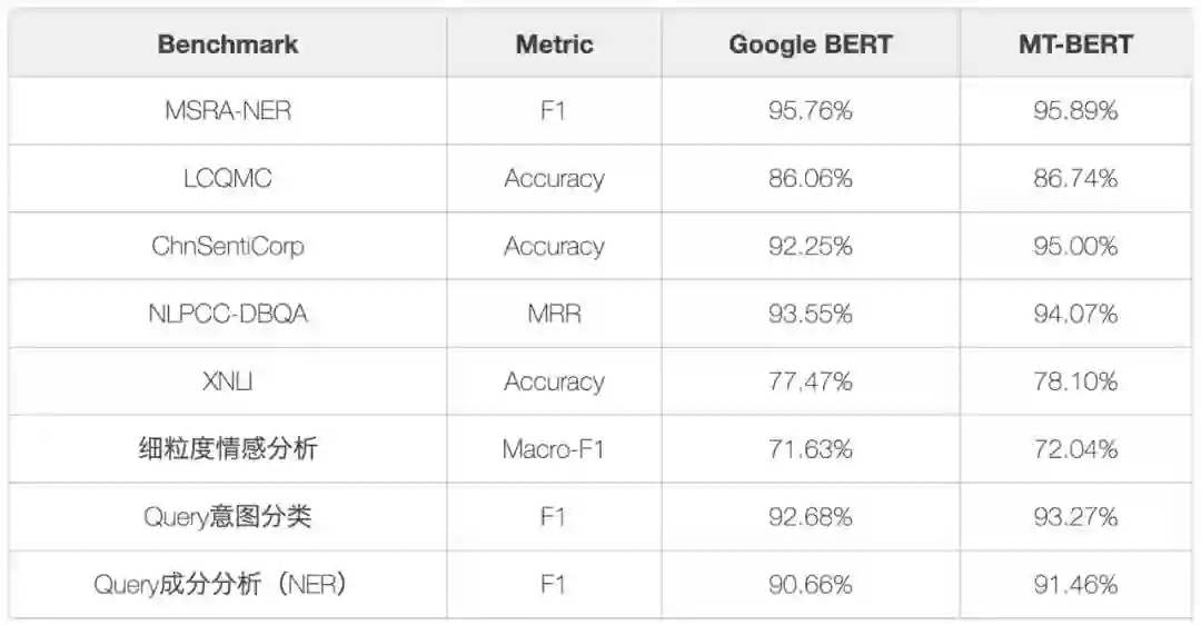 我们选择了5个中文Benchmark任务以及3个美团点评业务Benchmark在内的8个数据集对模型效果进行验证。实验结果如表4所示,MT-BERT在通用Benchmark和美团点评业务Benchmark上都取得了更好的效果。
