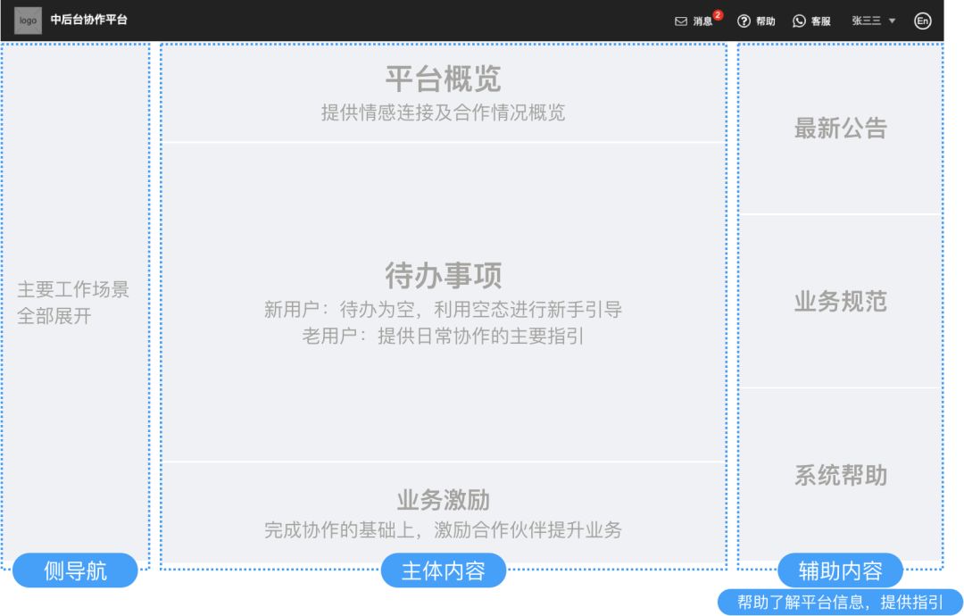 由此,我们会需要官方公告、帮助引导、待办事项、业务附能等内容模块,可以根据用户角色的不同分别显示。