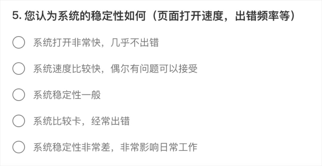 如上述问题,将比较抽象的 “系统稳定性” 转化为“页面打开速度和出错频率”来描述,答案也做了更具象的描述,方便用户确定他们的满意程度。