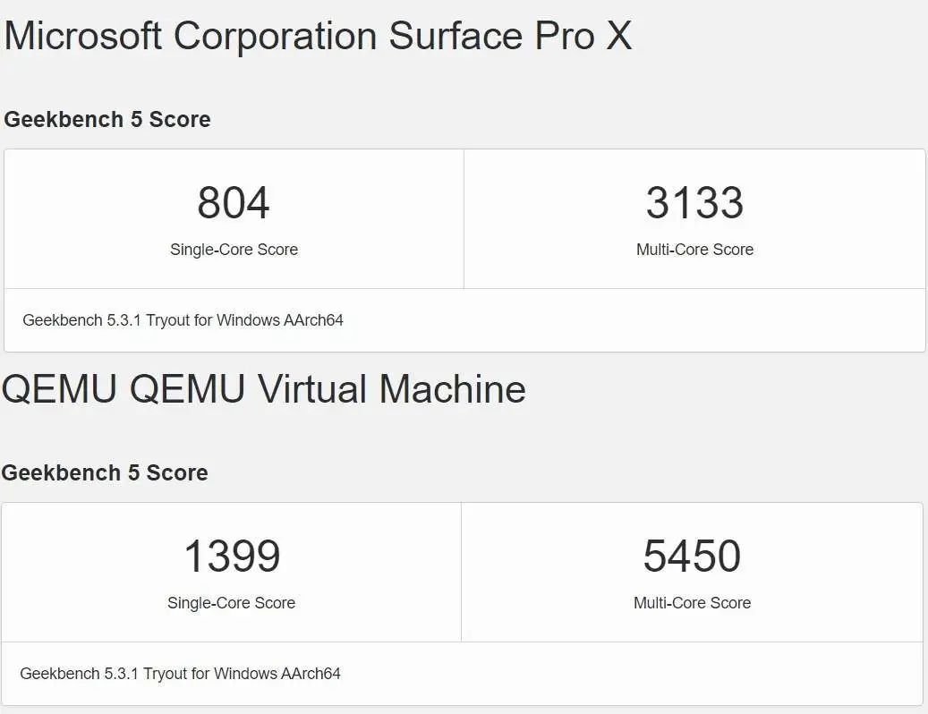 有推特用户分享了苹果苹果 M1 设备和微软 Surface Pro X 运 行Windows 10 的 Geekbench 成绩,跑分我们可以看到,苹果 M1 的分数分别是单核 1399 分,多核 5450 分。与之相对的 Surface Pro X 单核得分 804,多核得分 3133。值得注意的是,Surface Pro X 是原生运行 Windows 10 on ARM,配备的是高通骁龙 8cx 处理器。