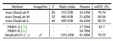 表 2:不同 Auto-DeepLab 模型变体在 Cityscapes 验证集上的结果。F:控制模型容量的 filter multiplier。所有 Auto-DeepLab 模型都是从头开始训练,且在推断过程中使用单尺度输入。