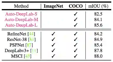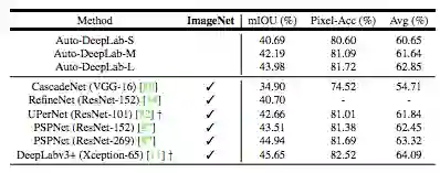 表 6:PASCAL VOC 2012 测试集结果。本研究提出的 AutoDeepLab-L 取得了可与众多在 ImageNet 和 COCO 数据集上预训练的顶级模型相媲美的结果。
