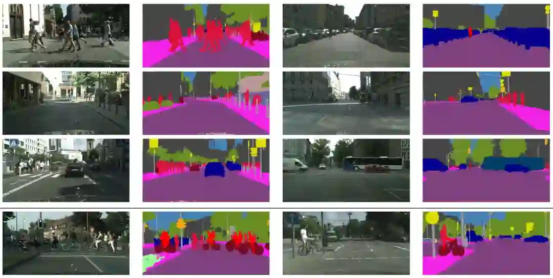 图 5:在 Cityscapes 验证集上的可视化结果。最后一行展示了本研究提出方法的故障模式,模型将一些较难的语义类别混淆了,如人和骑车的人。