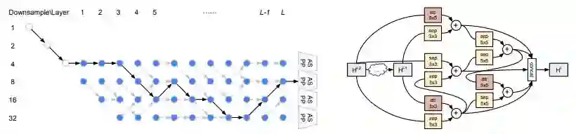 图 1:左图是 L = 12 时的网络级搜索空间。灰色节点表示固定的「stem」层,沿着蓝色节点形成的路径表示候选网络级架构。右图展示了搜索过程中,每个单元是一个密集连接的结构。