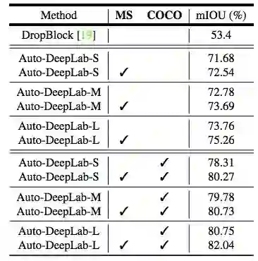 表 5:PASCAL VOC 2012 验证集结果。本研究采用多尺度推理(MS,multi-scale inference)和 COCO 预训练检查点(COCO)进行实验。在未经任何预训练的情况下,本研究提出的最佳模型(Auto-DeepLab-L)超越了 DropBlock 20.36%。所有的模型都没有使用 ImageNet 图像做预训练。