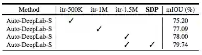 表 3:Cityscapes 验证集结果。研究采用不同的训练迭代次数(50 万、100 万与 150 万次迭代)和 SDP(Scheduled Drop Path)方法进行实验。所有模型都是从头训练的。