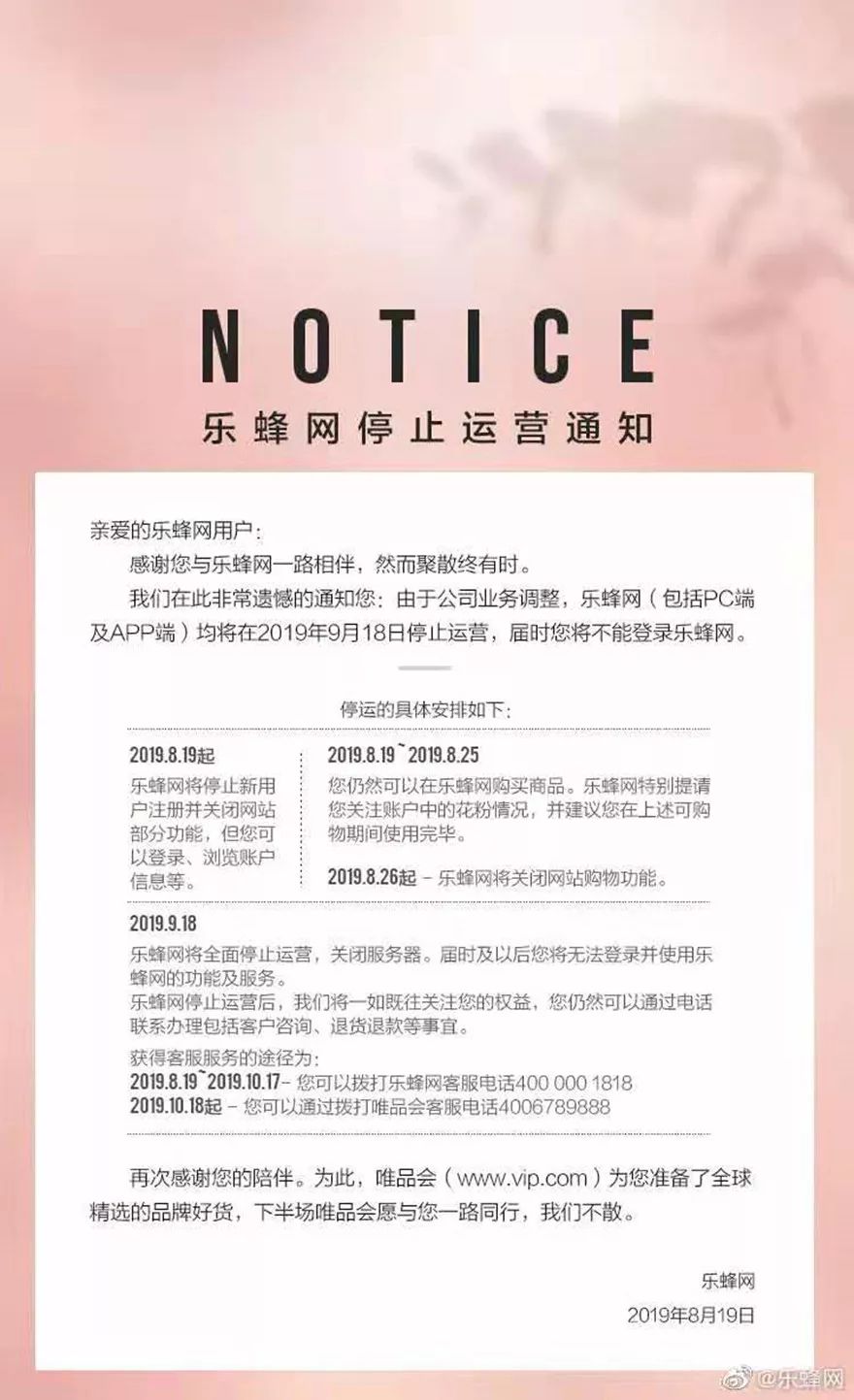 乐蜂网官方公众号也从即日起停止发布更新信息,并申请后台注销账号,给您带来的不便敬请见谅。