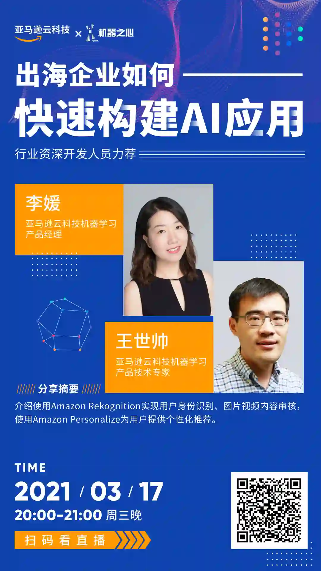 3月17日,亚马逊云科技机器学习产品经理李媛和亚马逊云科技机器学习产品技术专家王世帅将带来线上分享。本次分享将介绍如何借助Amazon Rekognition实现用户身份识别、图片视频内容审核与借助Amazon Personalize为用户提供个性化推荐。