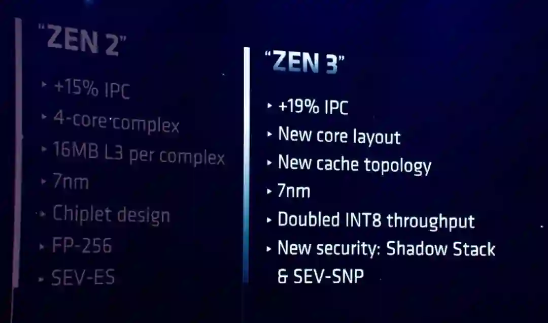 实现了 19% 的 IPC 提升,而这主要由于其采用了全新 Zen 3 架构,该架构改进了分支预测、执行 pipeline 更宽,每时钟周期加载 / 存储操作有所增加。