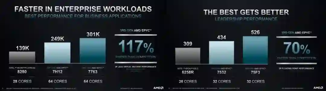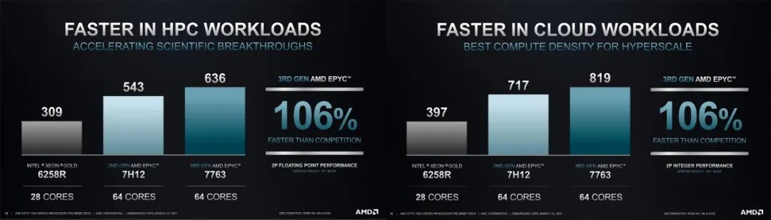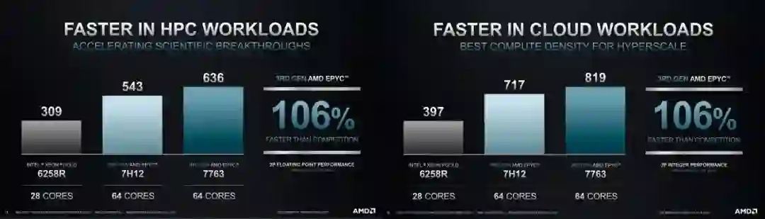 在高性能计算(HPC)和云计算工作负载方面,第三代 Zen 架构的 AMD Epyc 处理器较竞争对手英特尔双双提升了 106%: