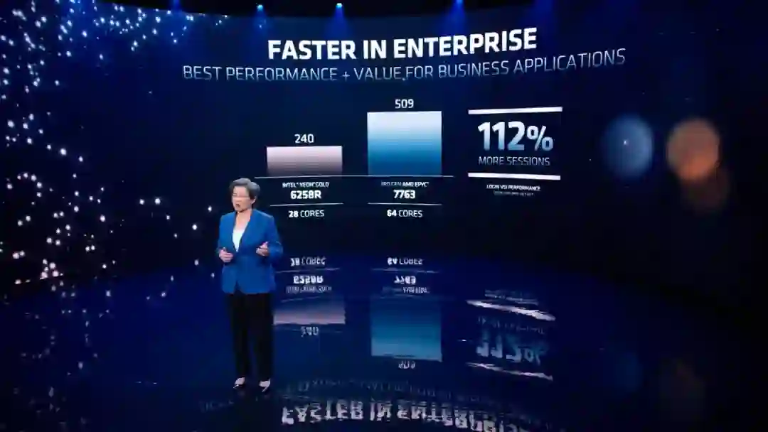 AMD 表示,「米兰」数据中心处理器比英特尔目前最好的数据中心芯片还要快。据了解,这款芯片由 AMD 设计,并委托台积电使用其 7 纳米芯片制程进行生产。