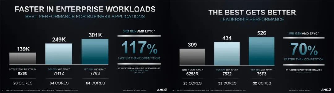 在企业工作负载方面,AMD Epyc 处理器提升了 117%。此外,即使从 64 核心的 Eypc 7763 降至 32 核心的 75F3,其性能依然较英特尔最佳性能提升了 70%。