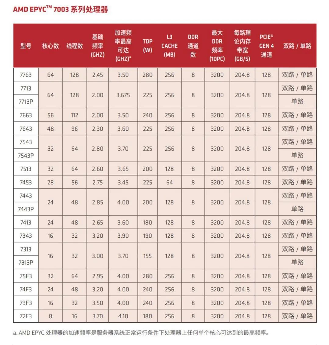 最高单核性能,这类 SKU 名称中的第三位为字母「F」,从 8 核 180W 72F3 到 32 核 280W 75F3;