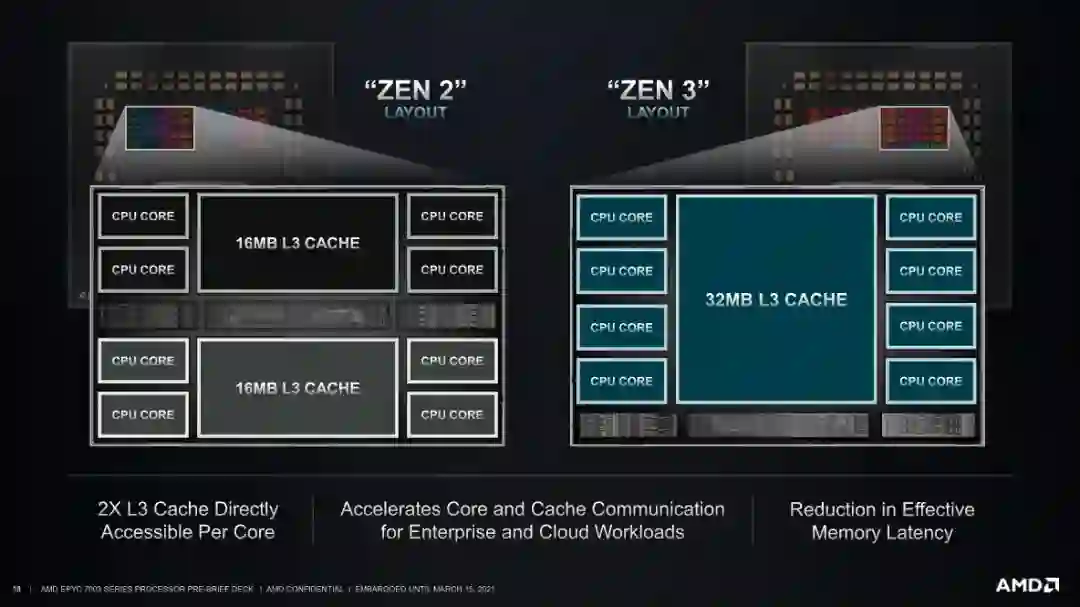 如果八核的 L3 缓存数据为 3MiB,则二代罗马处理器需要 6MiB,在每个四核组中它需要进行一次复制。而三代「米兰」处理器可以节省 3MiB 缓存,只用 3MiB 就可以服务八核,这也意味着单核可以处理更多 L3 缓存。其结果就是针对大型工作负载实现更快的内核与缓存通信,同时有效存储延迟也出现对应的降低。