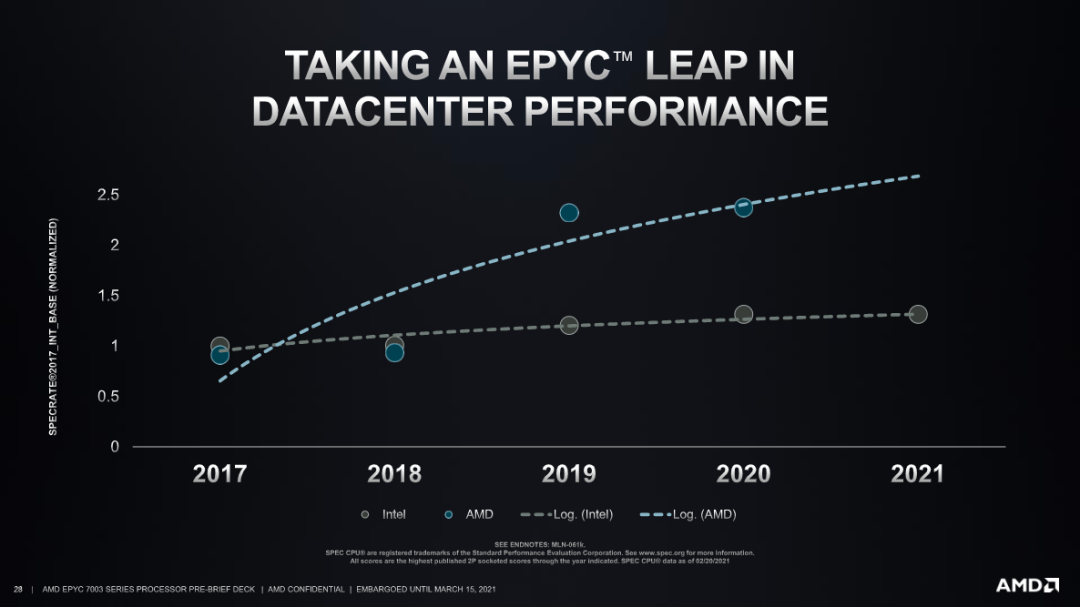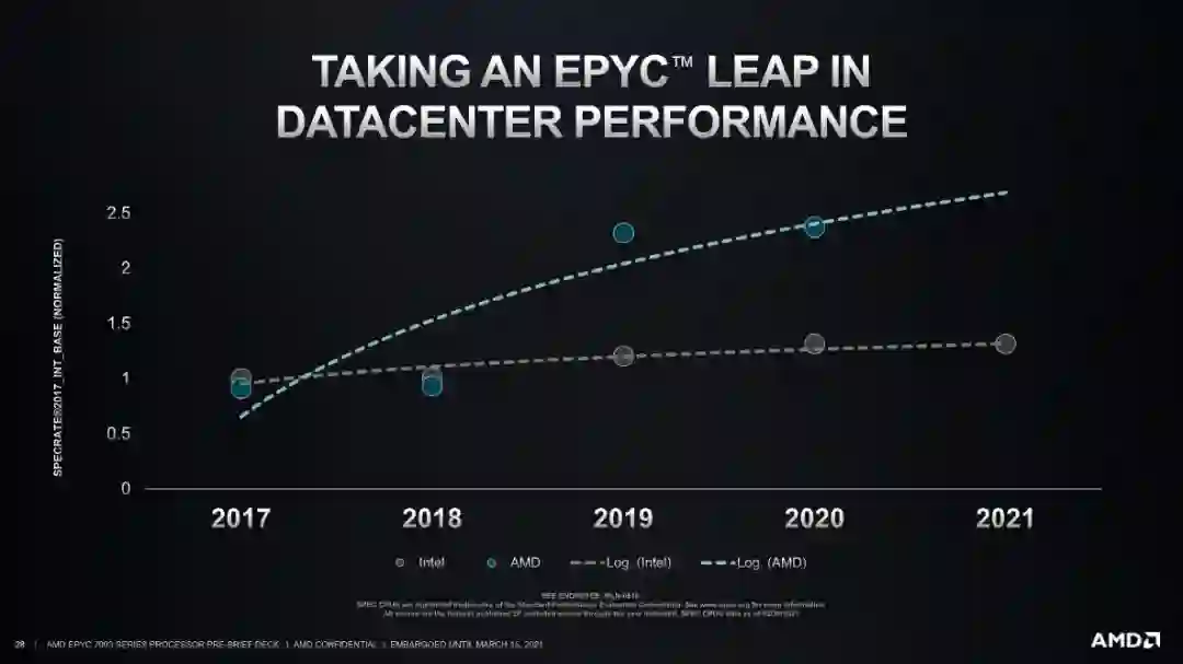 但与英特尔 Xeon 处理器相比,Epyc「米兰」的速度更快,且能够使用更少的物理空间和功率完成更多的工作。下图展示了 AMD Epyc 处理器与英特尔 Xeon 处理器不同的发展曲线,其中 Epyc 处理器在 2017 年实现了突飞猛进,超越了英特尔 Xeon,并在之后几年继续遥遥领先: