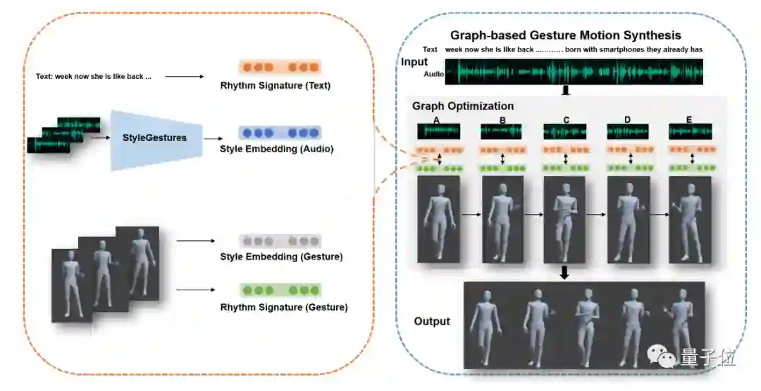 其中,上半身的动作最为重要,研究人员利用动态规划算法,从构建的动作图中搜索动作节奏和动作风格嵌入匹配误差最小的动作序列,同时保证前后动作的过渡代价小、过渡自然,最后输出一个节奏匹配的上半身动作序列。