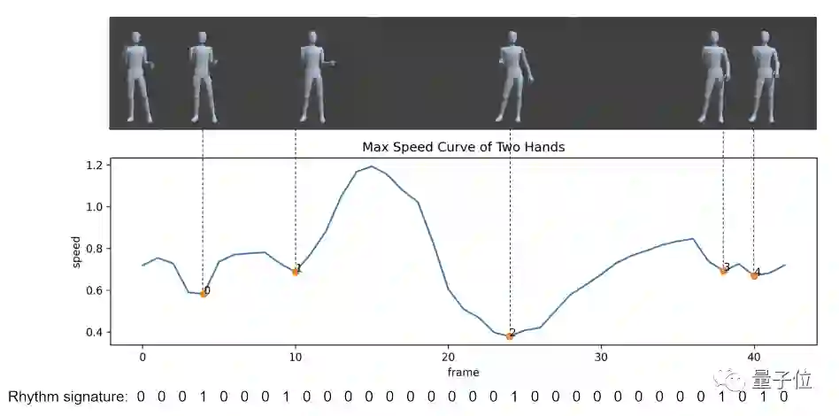 因此通过计算双手速度的极小值,把每个极小值的时间点作为节奏的时间点,最后每个动作片段的节奏可以表示为长度为32位的0-1向量,1表示手势动作变化的时间点。