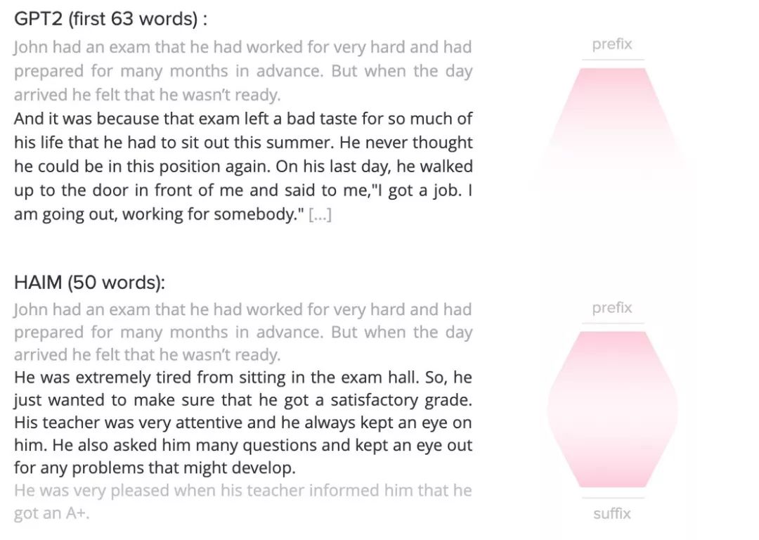 HAIM 的名字也是自己起的。研究人员输入开头「The team needed a name. The best suggestion...」(这个团队需要一个名字,最佳建议是……)和对应的结尾「...everybody agreed it was a great name for a state-of-the-art natural language generator.」(……每个人都认为这对当前最优的自然语言生成器而言是一个绝佳的名字)。然后模型提出了「HAIM」,研究者对这个缩略词进行了逆向工程,得到了「Halfway Acceptable Interpolating Machine」。(Shoham 博士称其为「玩笑式的事后合理化」。)