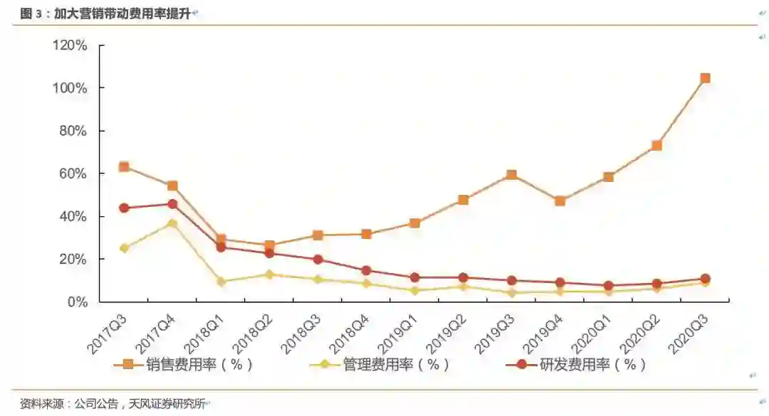 从过去三年的三费占比情况来看,跟谁学在2017年下半年和2018年上半年都在收缩。但2018年第三季度开始,营销费用明显爬升,直至2019年Q3。后面一个季度略有回落后,又直接猛爬升,从约50%增至最新的104.6%。