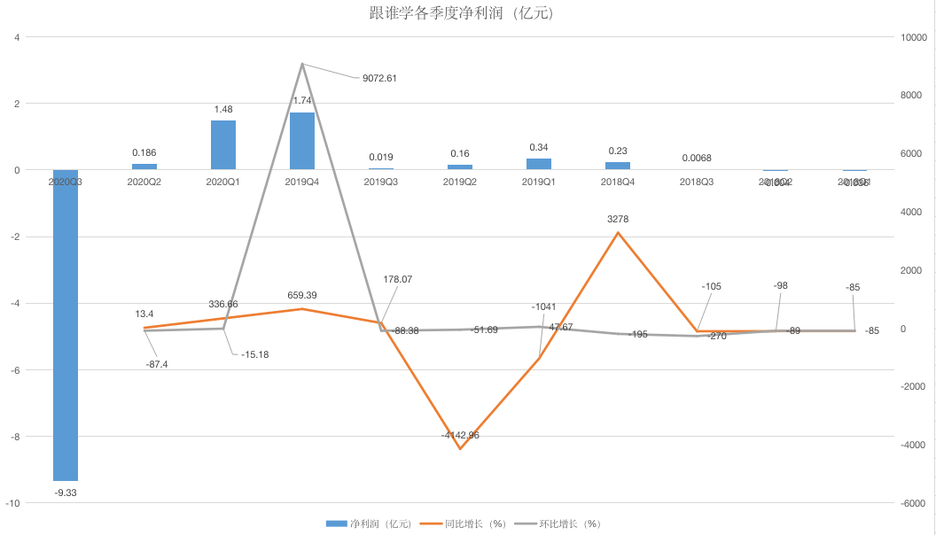 净利润方面,本季度跟谁学亏损9.3亿元,去年同期盈利190万元。从表中可以看到,跟谁学的净利润波动较大,侧面说明在线教育未到大规模盈利的阶段。