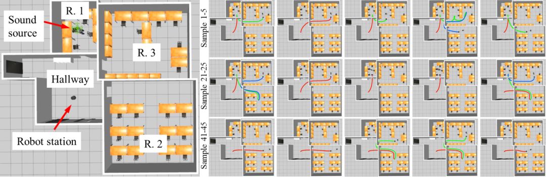 图4 模拟中增量学习过程的图示。声源在相应的现实世界中的位置被可视化。机器人随后按照模型预测的顺序访问房间。红色、绿色和蓝色轨迹表示机器人访问的第一、第二和第三个房间。行数描述了用于查找声源位置的轨迹数。