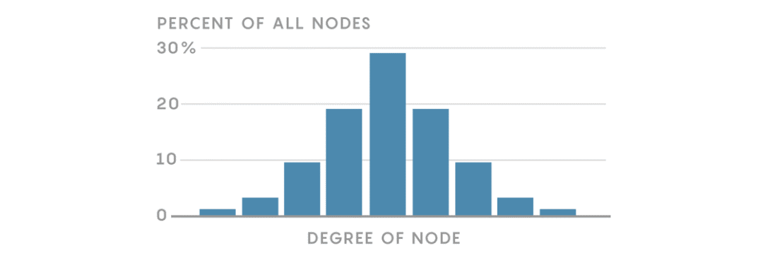 通过观察这个网络度的分布,我们可以推断出一种特殊的一致性:当涉及到连通性时,大多数节点是平均水平的,极少数是极端水平的。当涉及到理解网络结构时,这是非常有用的信息。(当有新增节点,比如有一个新人来到这个城镇,分布会稍稍改变,但是一般性的特征会维持不变。)