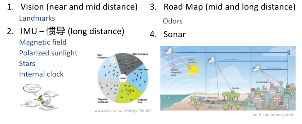 谈到这里不妨从仿生学看看自然界的鸟类是如何完成这件工作的,并从中得到启发。大家肯定知道候鸟导航能力是相当强的,可以跨越超过一万公里之外的目的地,顺利完成导航任务。它们是如何完成的呢?无外乎是依靠如下几类传感技术: