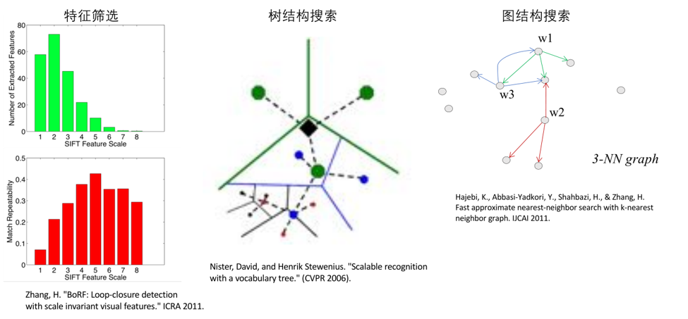 还可以利用有效的数据结构来加速完成匹配这件事,比如说用树结构存储特征来完成匹配,用图结构来存储地图里面所有的局部角点,以完成观察到图像中的角点和地图图像中的角点的快速匹配。另外一种方法是通过查表方法,在所有的搜索引擎里,百度和谷歌在搜索网页的时候,给几个关键词就能迅速把互联网中相关的网页找到,就是通过查表的方法。同样的方法可以利用到图像特征匹配,以完成全局定位这件工作。
