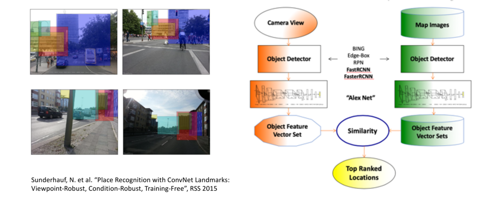 这些年这个方向也有了很快的发展,最近趋势可以通过下面这件工作来了解。首先是对一副图像更细的处理,检测和描述图像中的物体。框图左边和右边是类似的过程。进行图像中的物体检测后,再对每一个检测出的物体用神经网络进行描述,图像和图像之间匹配的工作可以通过匹配刻画物体的特征向量来完成,这个工作在全局定位算法中有最好的表现。