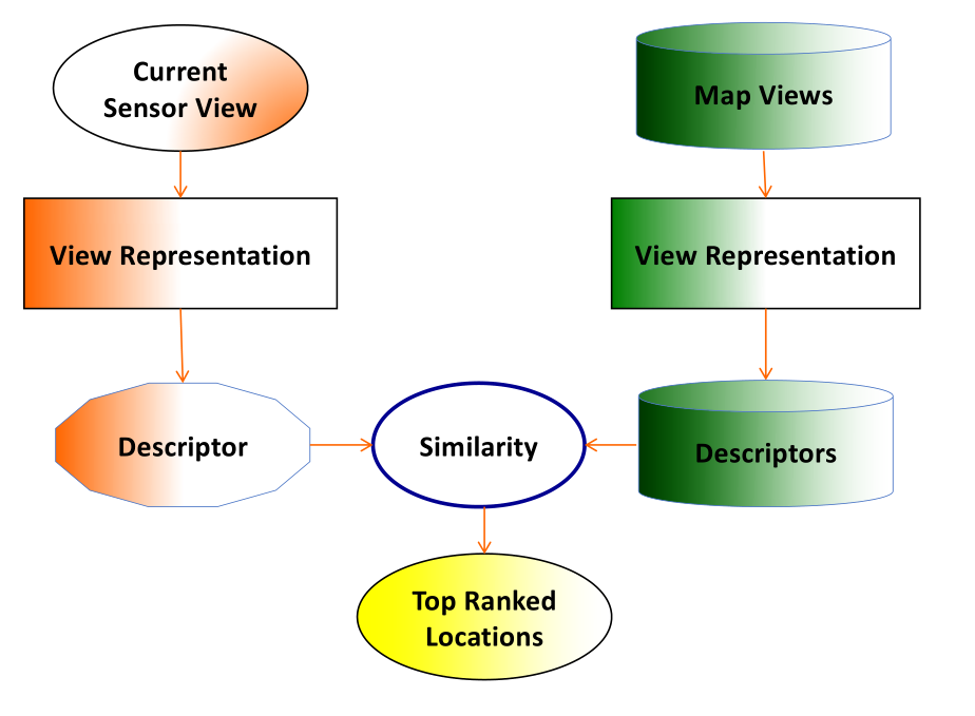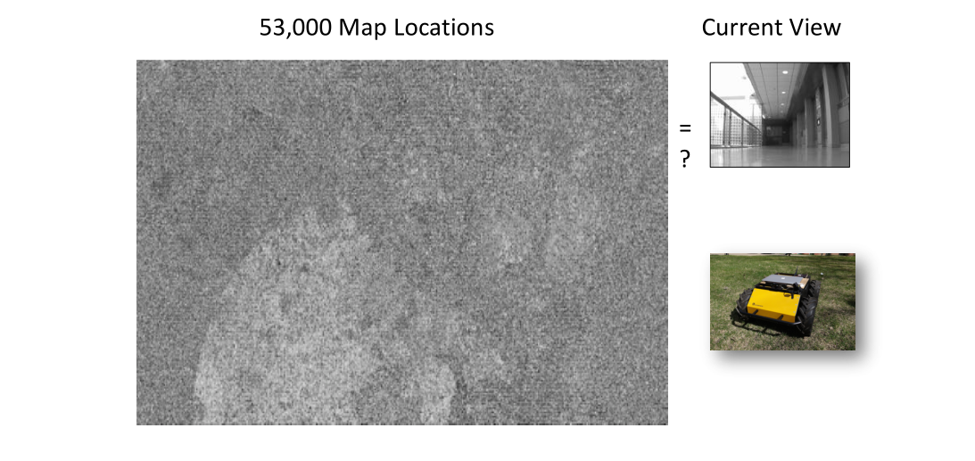 需要完成的定位工作可以通过这个画面去理解:给定一个地图,对地图关键帧和比较有特点的地方、地点进行视觉采样,即照一副照片,当下机器人观察到的是另外一个图像,这幅图像是不是在地图里面已经存储的某一幅图像?如果当下图像和地图中的图像成功匹配,那么也就完成了全局定位工作。