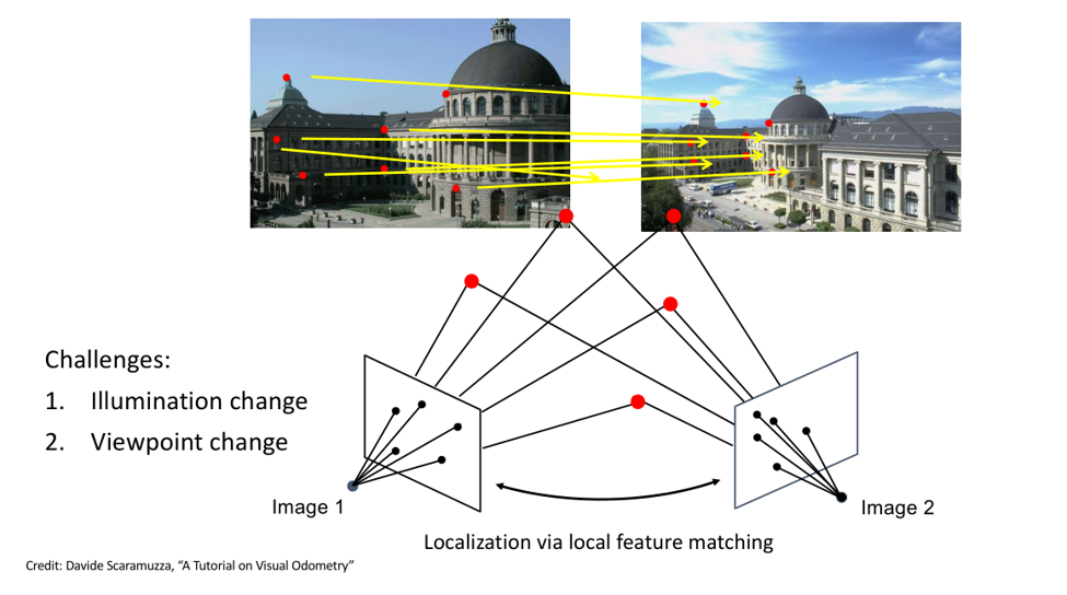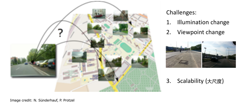 第一次和第二次访问不一定是同样的时间,光照和视角会发生变化。举例来说,上面两幅图像问大家是不是来源于同一个地方?大家可能需要认真地看一会儿才能作出正确判断,通过比如说这个楼和这个楼是同样一座楼,还有路旁的树木。