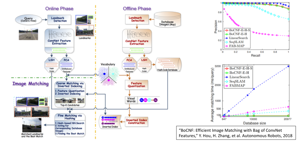 基于上述的全局定位的框架,我的另外一个学生在2018年完成了对这个框架的加速,下图中右上部分代表我们方法保留了现有框架的精度;下图右下的绿色和红色是我们提出的方法,运行的速度比其他方法要快很多,从绝对数量来说,几十毫秒就能完成在有2.1万张图像地图中的全局定位。