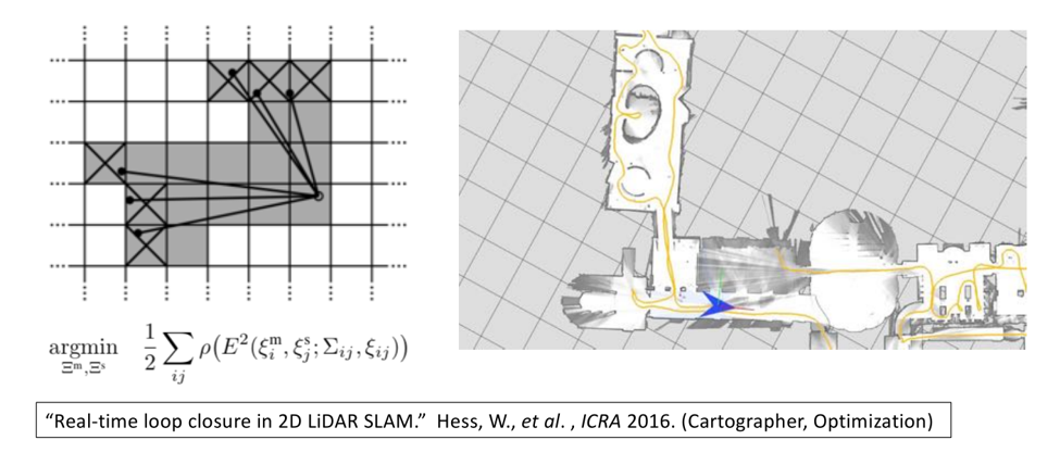 再往前推进10年是谷歌推出的大家比较熟悉的激光雷达SLAM算法,这也牵涉到全局定位的问题,通过对地图网格化,对机器人的位置进行估计,对特征提取这件事它最大的特点是它所使用的branch-and-bound优化方法很成熟,使得它做全局定位的方法比前人提出方法效果好很多。