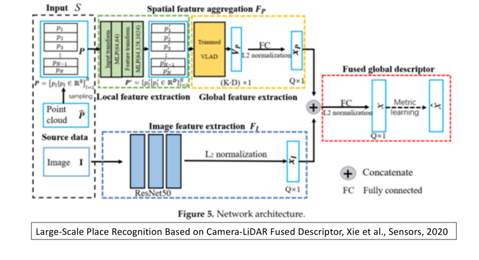 在今年刚刚发表的文章中,同样也是利用对激光雷达和视觉图像信息融合完成全局定位,但全部工作是利用深度神经网络完成。在该方法中,由点云、图像分别各产生一幅描述符,然后对两个描述符进行融合,之后产生融合后的描述符,这个融合后的描述符为全局描述符,用来完成全局定位工作。