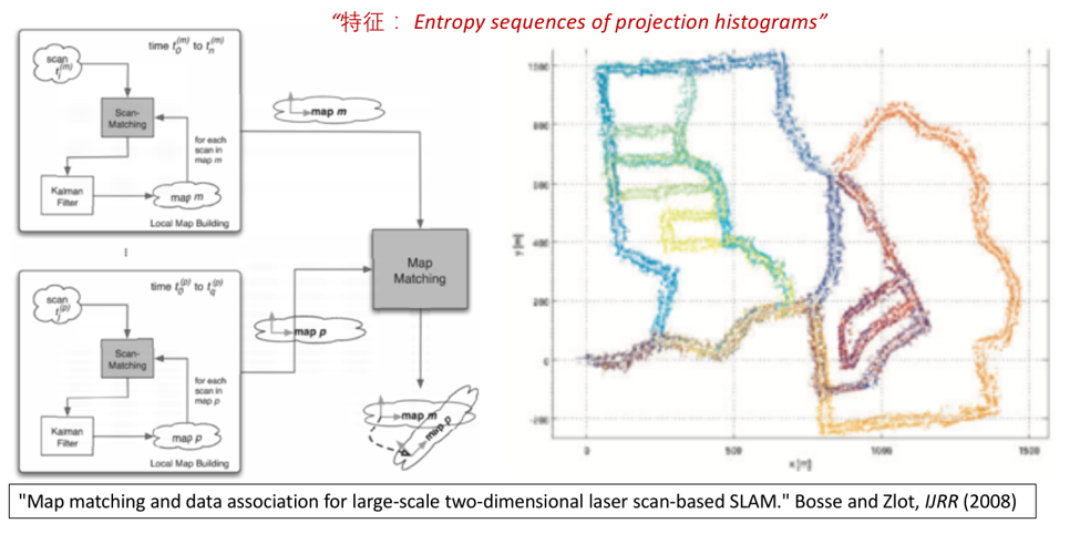 再往前推进10年,到2008年的时候,也有代表性的文章,通过子地图匹配的方法。刚刚讲到了做全局定位时往往需要对原始数据进行处理,原始数据量大,辨别力低,处理比较麻烦,所以需要对其进行特征提取。这个文章提出了一个基于直方图的特征,用这些直方图来刻画子地图,完成对子地图之间的匹配。相当于用一个点云对准的方法完成这个定位的过程,就是把定位的问题转换为点云对准的问题加以解决。