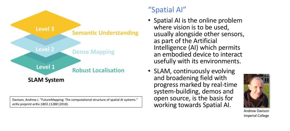 所以语义刻画是目前业界比较关注的研究方向,ppt中这个白皮书的作者,是做SLAM工作、大家熟悉的AndrewDavison,白皮书中他提出了Spatial AI的概念。我们做移动机器人工作也是在做人工智能,只是跟空间息息相关的人工智能,而SLAM技术是人工智能的基础工作,是必不可少的工作。