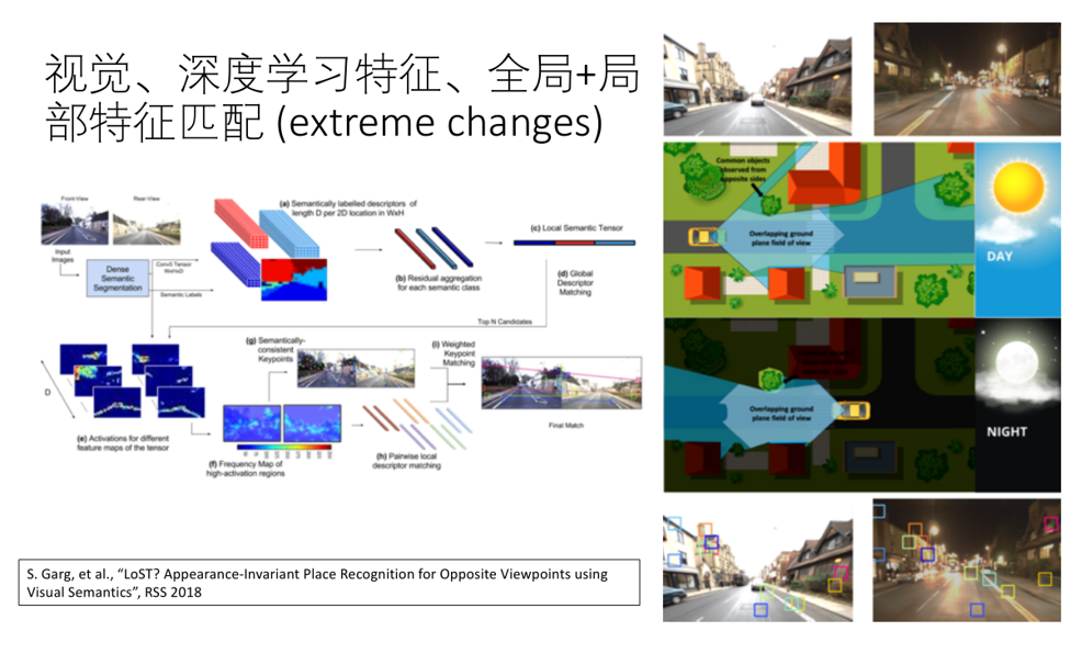 从位置角度看,汽车到达了同一地点,但图像获取的方向和光照条件完全不一样,在这种极度变化条件下如何完成这两组图像匹配?上图右上面的两张图是机器人拍下来的。解决方案分两步走: